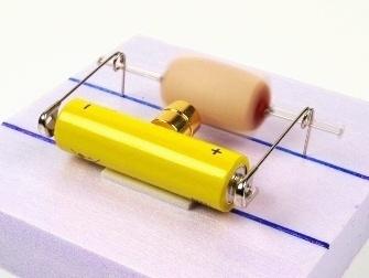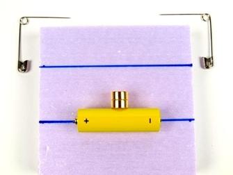 Tu as besoin d'un aimant permanent (deux aimants en anneau) et un électroaimant (bobine) avec axe de rotation (épingles) qui s'allume et s'éteint dans le bon rythme (interrupteur). Cela ne fonctionne bien sûr pas sans courant. Tu as ainsi également besoin d'une source de tension (pile).
