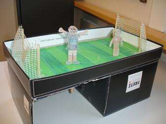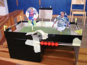 "Zuerst haben wir ein Tor rausgeschnitten, dann haben wir die Eckfahnen konstruiert. Für den Balleinwurf haben wir den vorderen Teil einer PET-Flasche verwendet. Das Spielfeld haben wir im Internet ausgedruckt. Wir haben auch noch eine Anzeigetafel und Punktezähler gemacht."