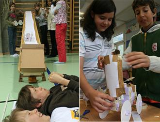 Eine Gruppe von vier Kindern hat miteinander eine schnelle Rampe mit optionalen Papierüberleitungen gebaut.