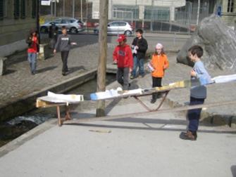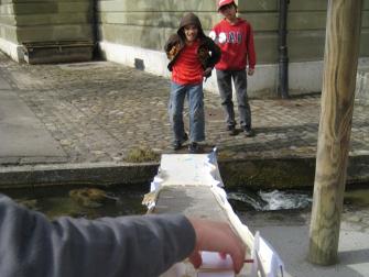 Diese Klasse von Dominic Urben aus der Matte bei Bern, überquert einen Bach mit den Flitzern. Ob wohl alle die Distanz meistern konnten?