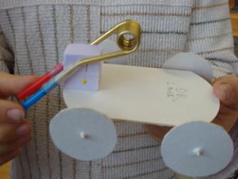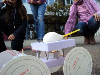Auch diese Mädchen aus der Klasse von Heinz Hunziker haben versucht eine Fahrzeug mit thermischer Energie in Bewegung zu bringen. Der Dampf welcher entsteht, wenn im Ei Wasser erhitzt wird, erzeugt einen Rückstoss beim Austritt aus dem Trinkhalm.