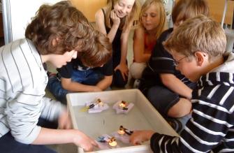 Beobachten geht auch im kleinen Plastikbecken. Diese Fünftklässler haben sich eine Rako-Kiste geschnappt und probieren ihre Tuctuc-Boote aus.
