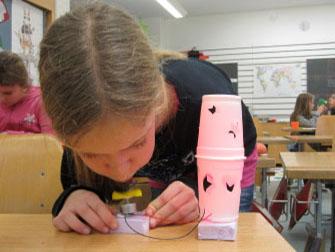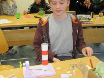 Heute waren wir eigene kleine Erfinder. Wir durften mit LED-Lämpchen, und Kabeln arbeiten. Den Strom für das Licht erzeugten wir mit Windenergie. Es gab ein paar echt gute Ideen, wie der Leuchtturm von Yanik. Mit einer Papierröhre und Papier sah er wirklich wie ein Mini-Modell aus. Oben hat der Leuchtturm später noch ein weisses Dach mit einem Loch für die Lampe bekommen.
