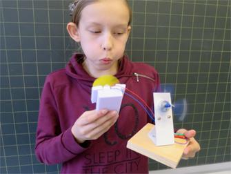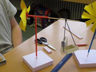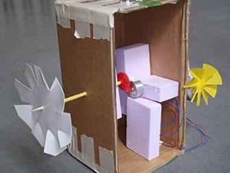 "Ich hatte die Idee, einen Ventilator zu bauen, weil ich Wind sehr gerne habe. Im Keller habe ich nach einem Windrad gesucht und bin fündig geworden. Es war ein solarbetriebenes Windrad. Ich habe es umgebaut. Zum Schluss habe ich das Windrad auf eine Hartschaumplatte geklebt, so dass es das andere Windrad antreibt."