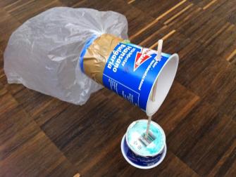 Zu beachten ist vor allem die Lagerung oben auf dem Stab. Der Plastikbecher, welcher den Sack hält, kann sich um den Stab frei drehen. Dazu ist er oben drehbar mit einem Reissnagel fixiert. (Michael 13)