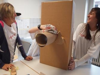 Der Wind wird durch das Rohr auf eine Folie, welche sich hinten im Karton befindet, gelenkt. Die drei Mädchen (Sara 13, Nadja 12 und Mirjeta 13) können so an der Spannung der Folie die Stärke des Windes ablesen.