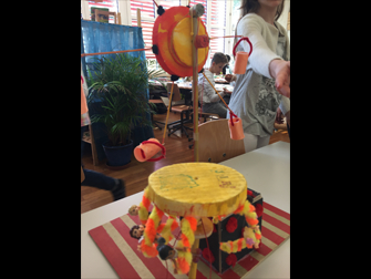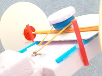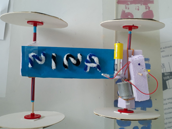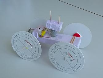 "Das Fahrzeug wird die Rampe hochgezogen, indem wir einen Faden an ein Holzstäbchen gebunden hatten und dieses drehte sich wie eine Seilwinde. Das andere Ende des Fadens haben wir an eine Agraffe gebunden, welche im Auto steckte.Weil die Seilwinde zu wenig Kraft hatte, haben wir das Auto zusätzlich mit einem Motor angetrieben."
