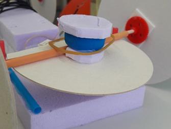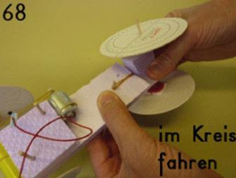 Der Werklehrer Andi Bühlmann hat uns eine Anleitung geschickt, wie man die Achse so umbauen kann, dass das Fahrzeug einen Kreis fährt. Das Hartschaumstück ist dazu schräg zerschnitten worden und mit einem Gummi so fixiert, dass man es durch Drehen in einen anderen Winkel bringen kann.
