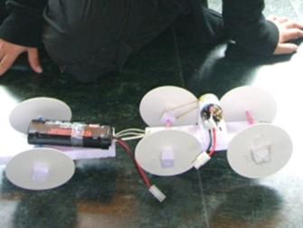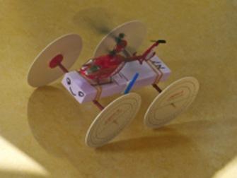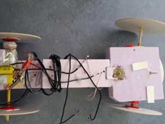 Der ferngesteuerte Heli wird hier benutzt um das Fahrzeug in Bewegung zu bringen. Das Bild stammt von Erfinde-Coach Max Maurer. Ob man es damit auch Lenken kann?