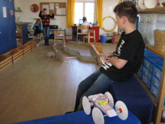 "Wir haben ein Autorennen veranstaltet, den Grand Prix von Mörschwil. Aus Karton und mit Bänkli und Kissen haben wir Banden gebaut. Aber der Karton war zu schwach und als die Autos hineinfuhren, gingen die Banden kaputt. Unsere Flitzer waren sehr schnell, weil wir zum Teil zwei Motoren und vier Batterien angeschlossen hatten. Aber Kurven fahren konnten wir nicht. Und wenn man zu viele Batterien und Motoren draufpackt, ist der Flitzer zu schwer und fährt nicht mehr gut!"