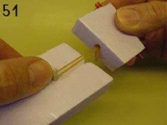 Dazu führt er einen Gummi durch das eine Teil und fixiert ihn mit einem Röhrli das im Schaum eingelassen ist. Dieser Trinkhalm dient gleichzeitig als Achslagerung- clever!!