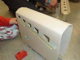 Mit der Maschine aus Karton kann man Münzen nach ihrer Grösse sortieren. Dazu lässt man sie oben auf die Bahn und sie rollen je nach Grösse in eines der Löcher. In der Maschine drin landen die Münzen in roten Schubladen, die man von aussen öffnen kann. So kann man leicht auf die gewünschten Münzen zugreifen.