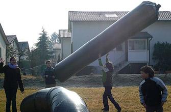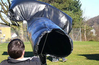 Nun hältst Du die andere Öffnung weit auf und bewegst Dich etwas vorwärts, damit Luft in das Innere des Schlauches kommt und dieser sich aufbläht. Das geht am besten zu zweit. Der Schlauch sollte am Ende nicht zu prall gefüllt sein.