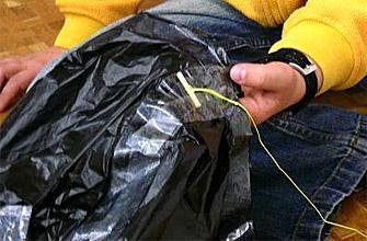 Knüpfe ein Holzstück an die Schnur und befestige das Holzstück mit Klebeband am Solarballon.