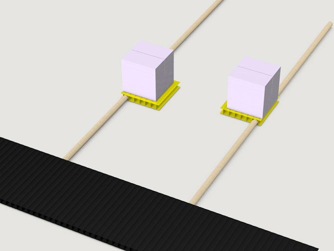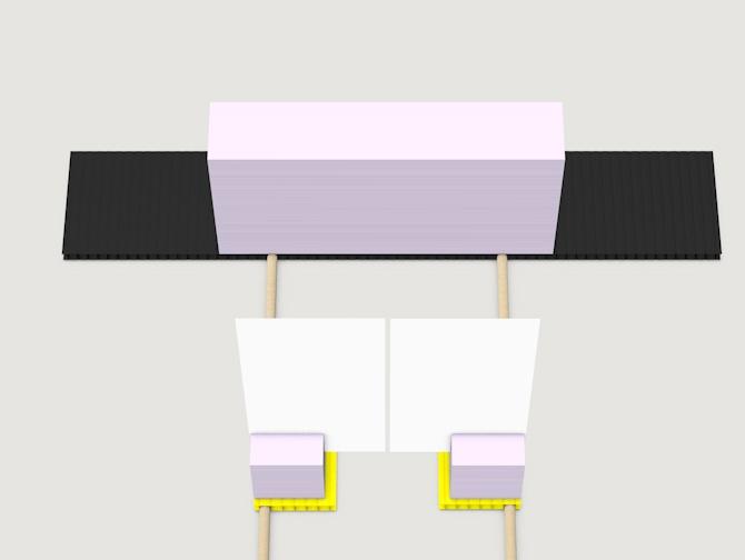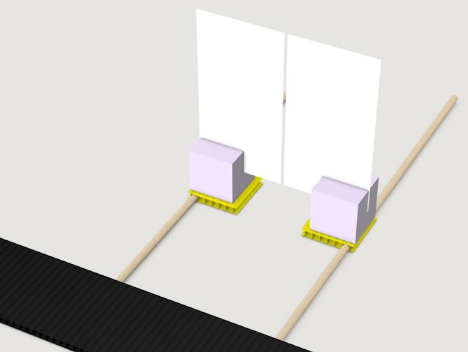 Klebe mit Doppelklebeband die zwei Hartschaumwürfel mit den Einschnitten auf die gelben Hohlkammerplatten.